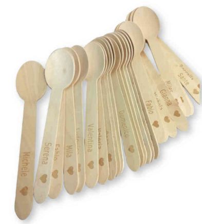 • Se crei bomboniere e vuoi abbinare cucchiai di legno personalizzati, questa è la soluzione perfetta! Queste posate di legno usate come gadget rendono il tuo evento green eco-sostenibile unico! Personalizza questi cucchiai di legno con il tuo logo, un testo o una frase d’impatto che lascerà i tuoi invitati piacevolmente sorpresi