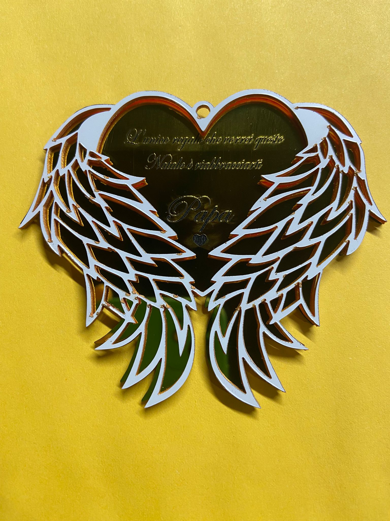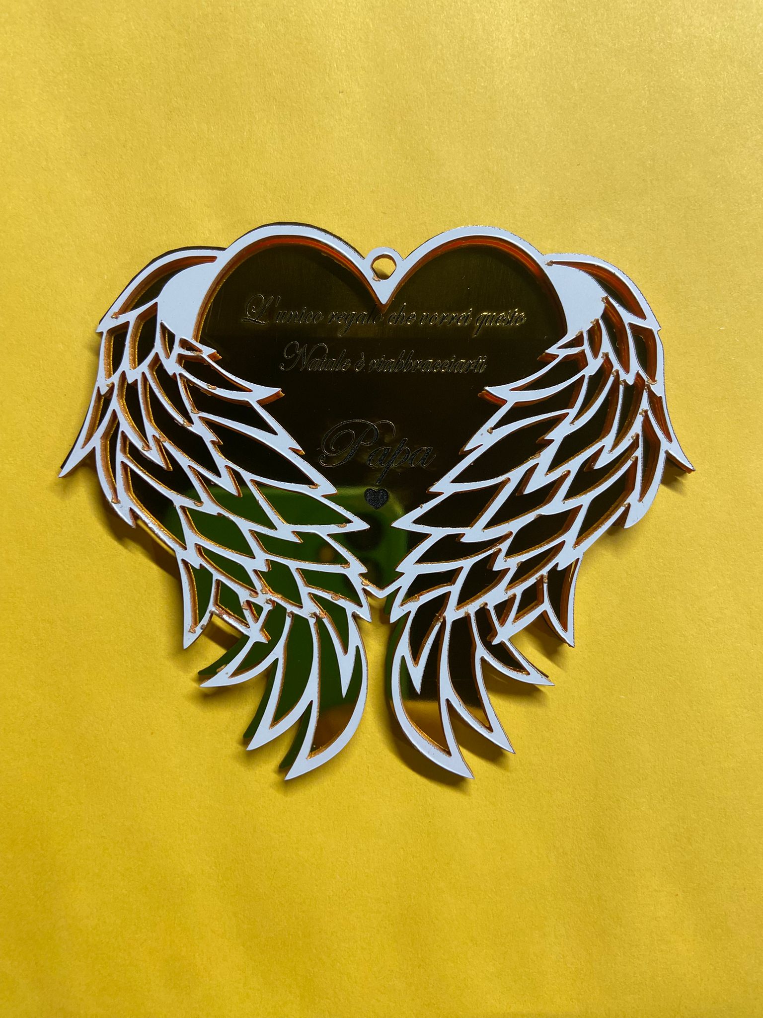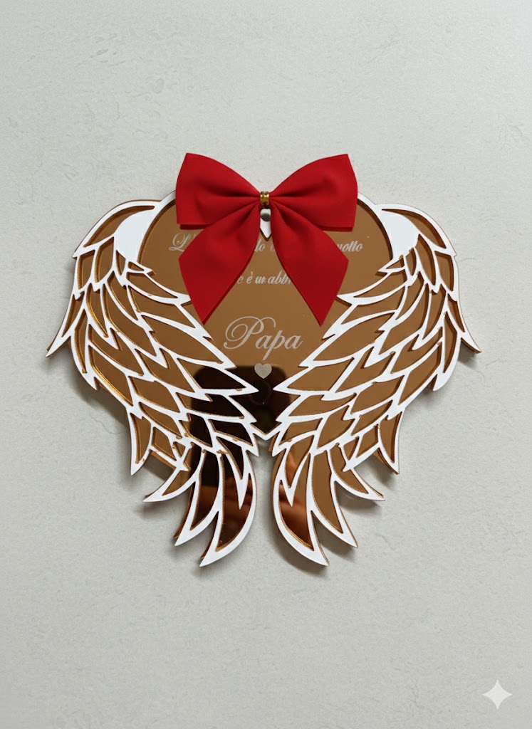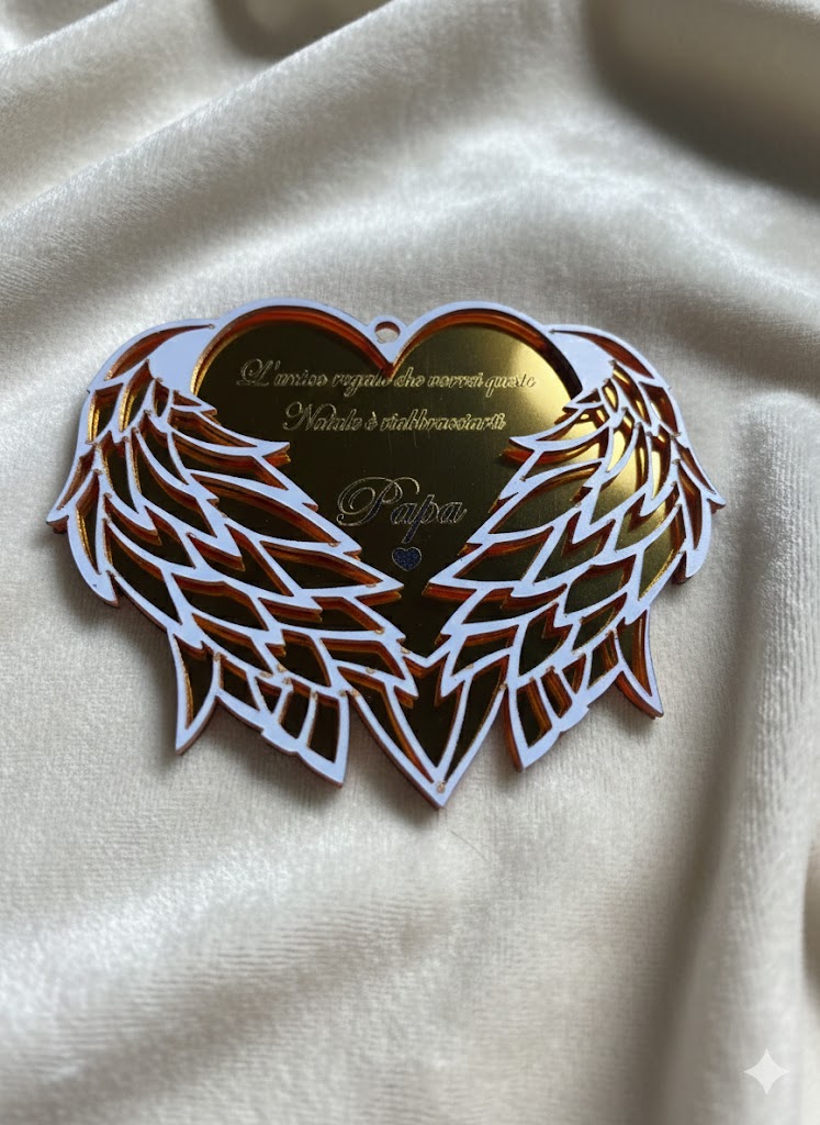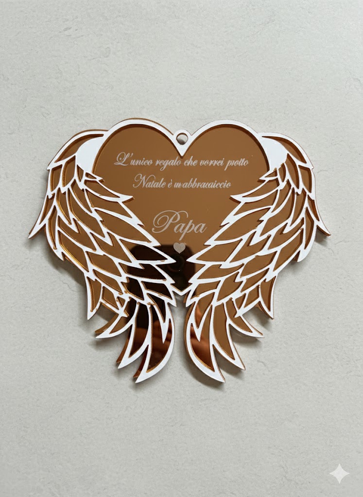 Questo Natale, celebra l’amore eterno e la memoria di una persona speciale con il nostro esclusivo addobbo a forma di cuore con maestose ali. Realizzato in acrilico effetto specchio color Oro Rosato, non è solo una decorazione, ma un messaggio d’amore che risplende sull’albero.