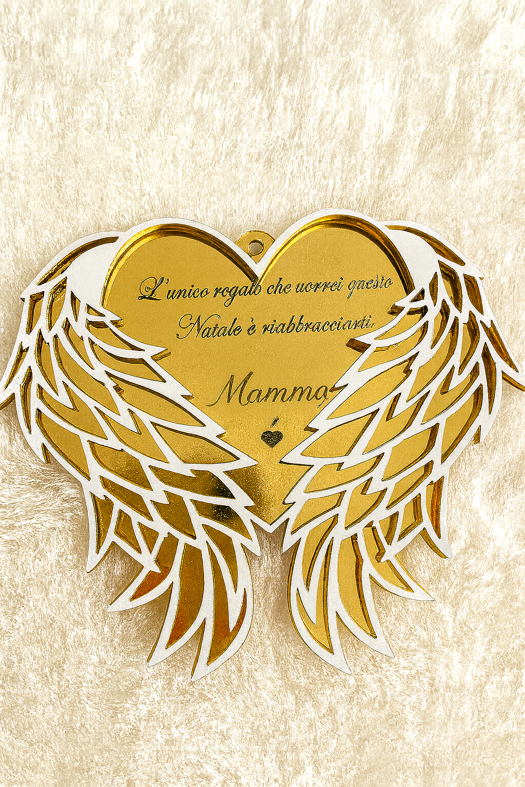 Il cuore reca incisa una dedica toccante, che parla al cuore di chi non c’è più: “L’unico regalo che vorrei questo Natale è un abbraccio, [Nome da personalizzare]”.