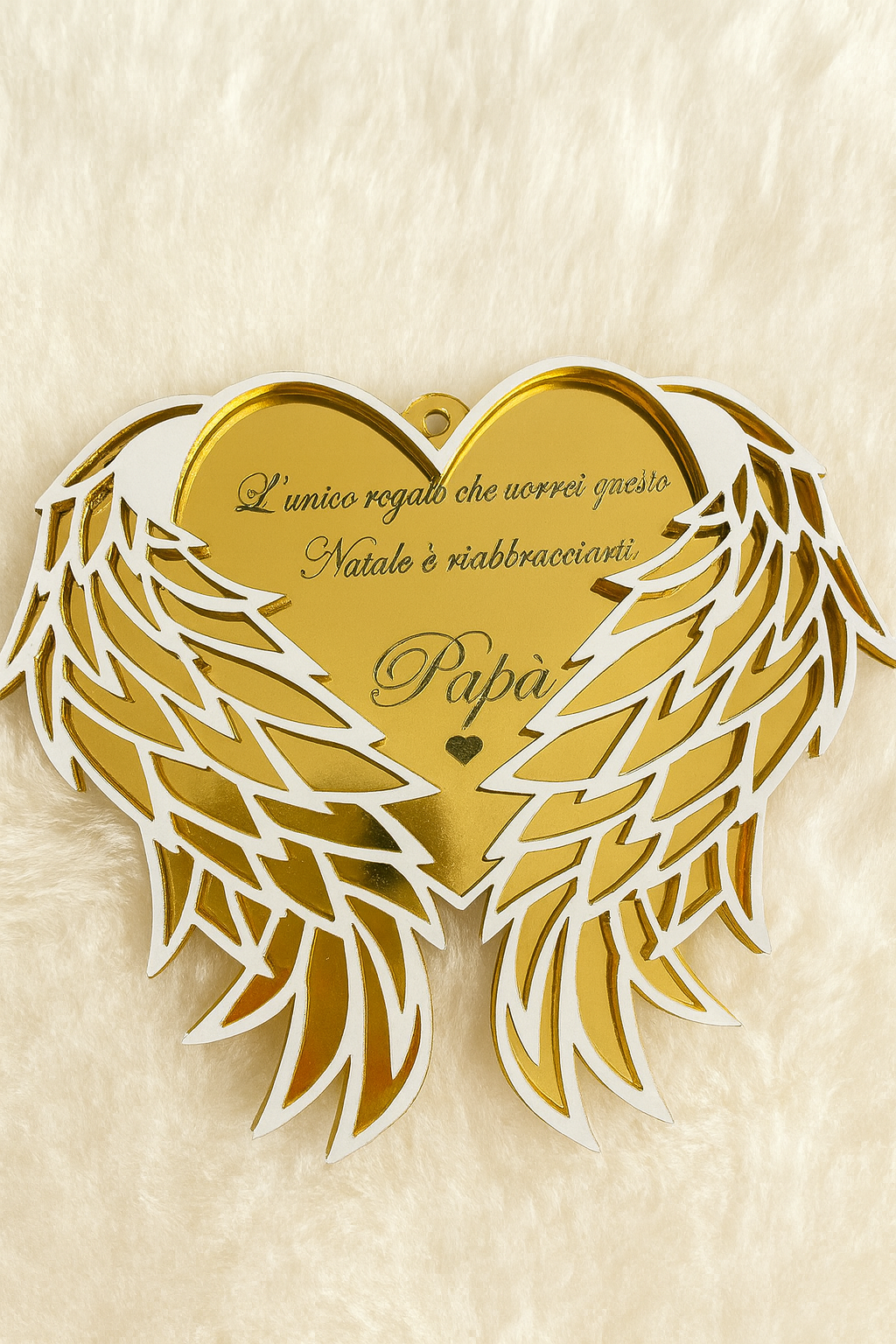 È il modo più delicato e profondo per esprimere il desiderio più grande di chi non può più riabbracciare un caro, trasformando il dolore in un ricordo luminoso e consolatorio. Puoi personalizzare l’incisione con il nome della persona amata (Papà, Mamma, Nonno, un caro amico, ecc.). Appendilo al tuo albero e senti la sua presenza accanto a te, come un angelo custode che veglia sulle tue Feste.